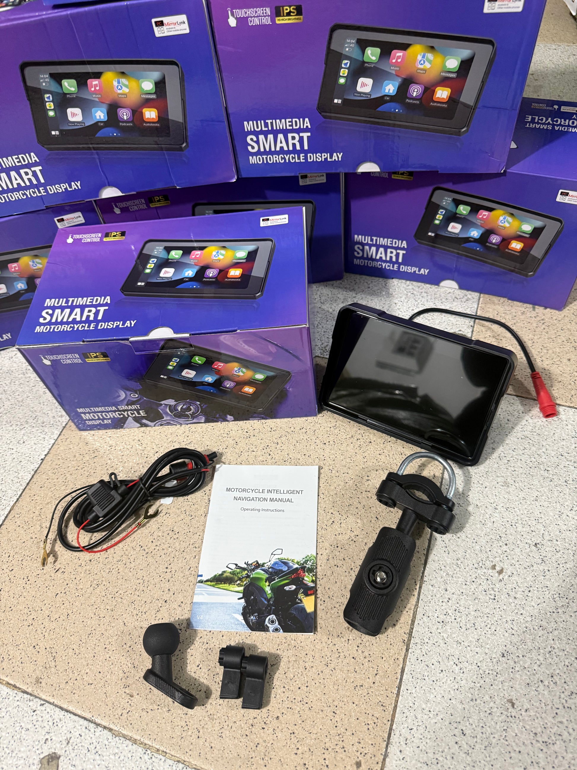 Nueva pantalla de navegación para motocicletas de 5 pulgadas con GPS.Esta pantalla táctil inalámbrica despliega Apple CarPlay para iPhones y Android Auto para teléfonos Android. Es impermeable, lo que la convierte en la herramienta perfecta para tus rodadas.